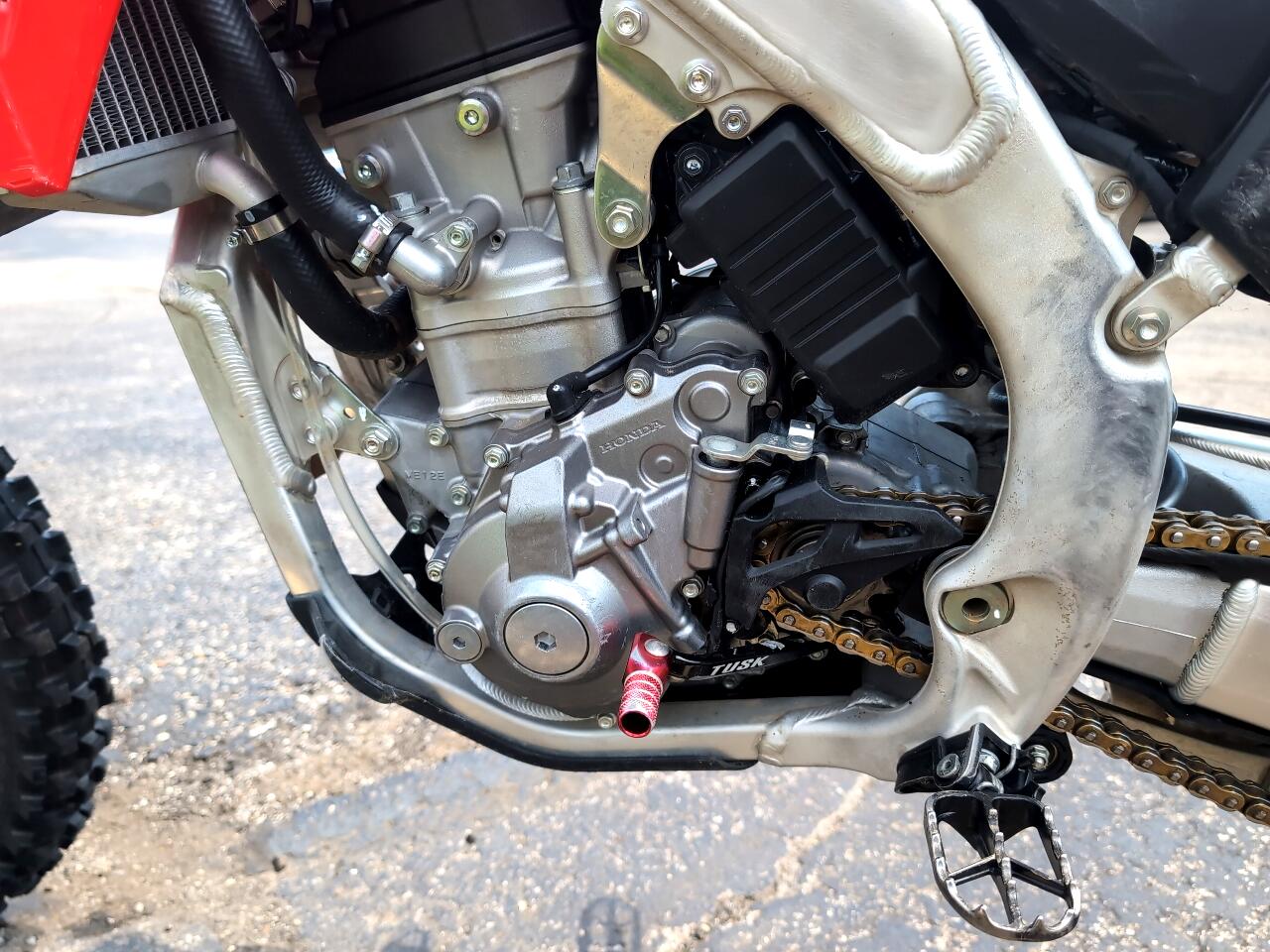 The suspension is fully dialed in for competitive riding. Up front, a 49mm fully adjustable Showa coil-spring fork offers 12.2 inches of travel, while the Pro-Link rear suspension system with a fully adjustable Showa shock provides 12.1 inches of travel—perfect for tackling big jumps and rough terrain.